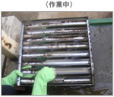 2.蛍光管真鍮の表面部分に専用溶剤を用いハケにて塗布後、時間を少し置く。柔らかいスコッチや布等で表面を擦り、汚れをウエスにてふき取る。この後再度専用洗剤にて表面を洗浄後丁寧にふき取り、空拭きも行う。
